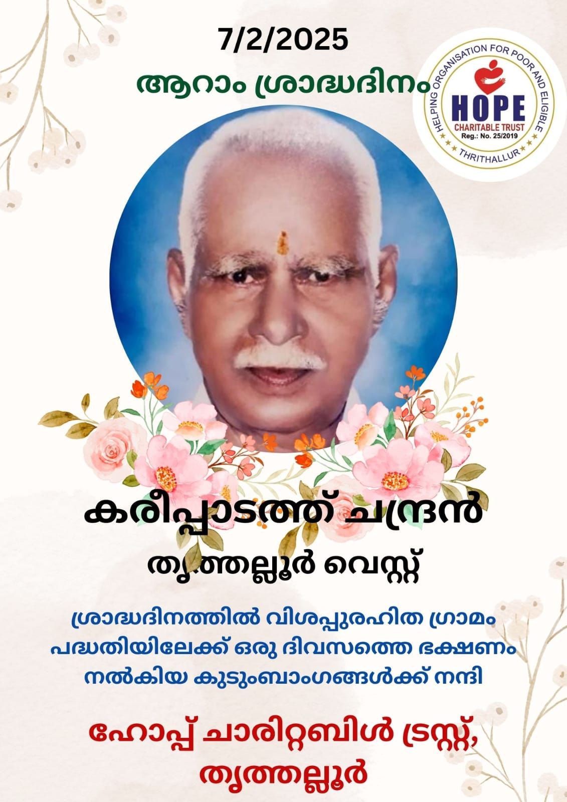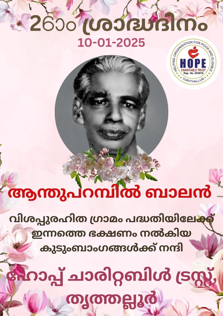 Hope Charitable Trust sincerely thanks the family of Kareepadath Chandran for generously providing today’s food (07.02.2025) in remembrance of his 6th death anniversary. Your thoughtful gesture of kindness and compassion is truly appreciated, bringing comfort and support to many hearts. Thank you!