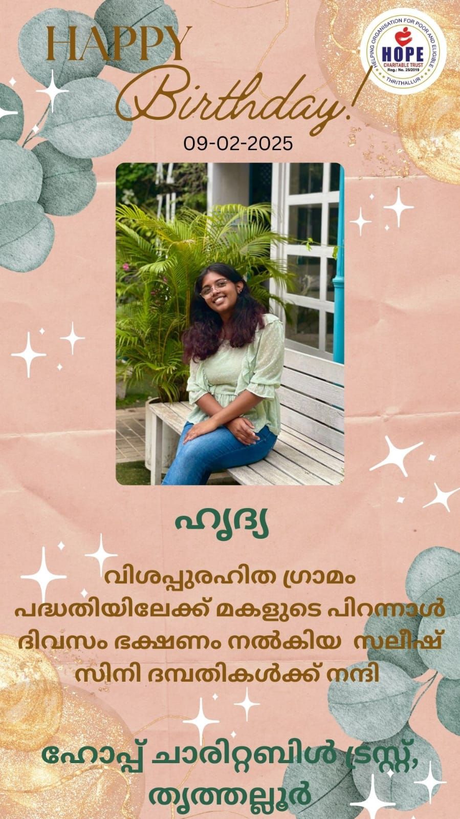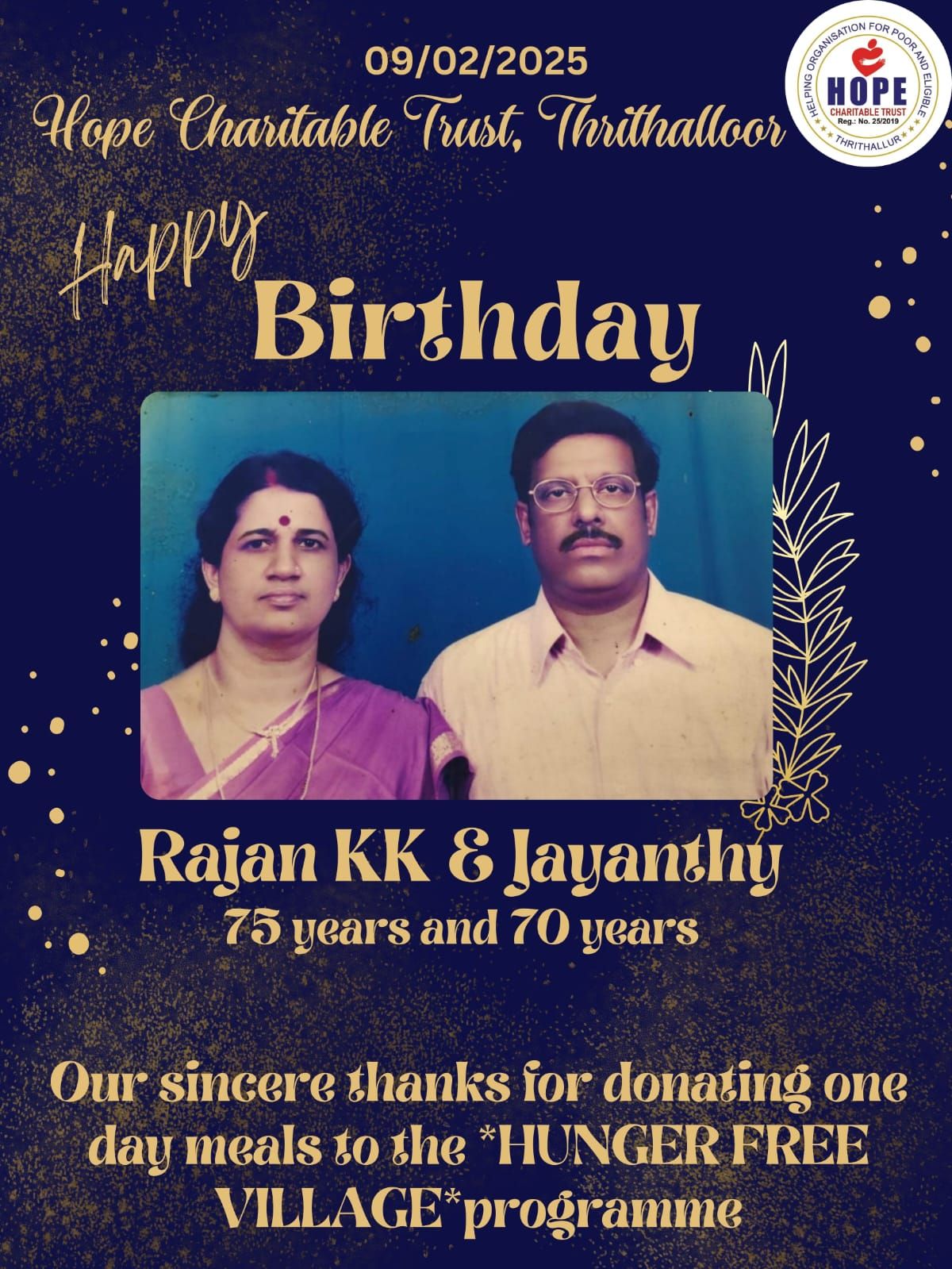 Hope Charitable Trust sincerely thanks Rajan KK and Jayanthy for generously providing today’s food (09.02.2025) in celebration of a birthday. Your kindness and compassion have brought joy and comfort to many hearts. Wishing you a wonderful day filled with happiness and blessings. Thank you!