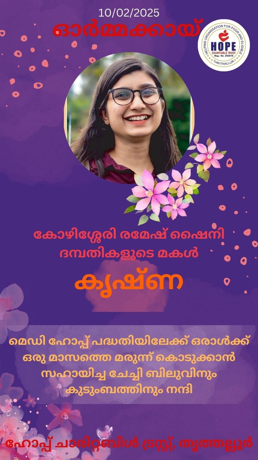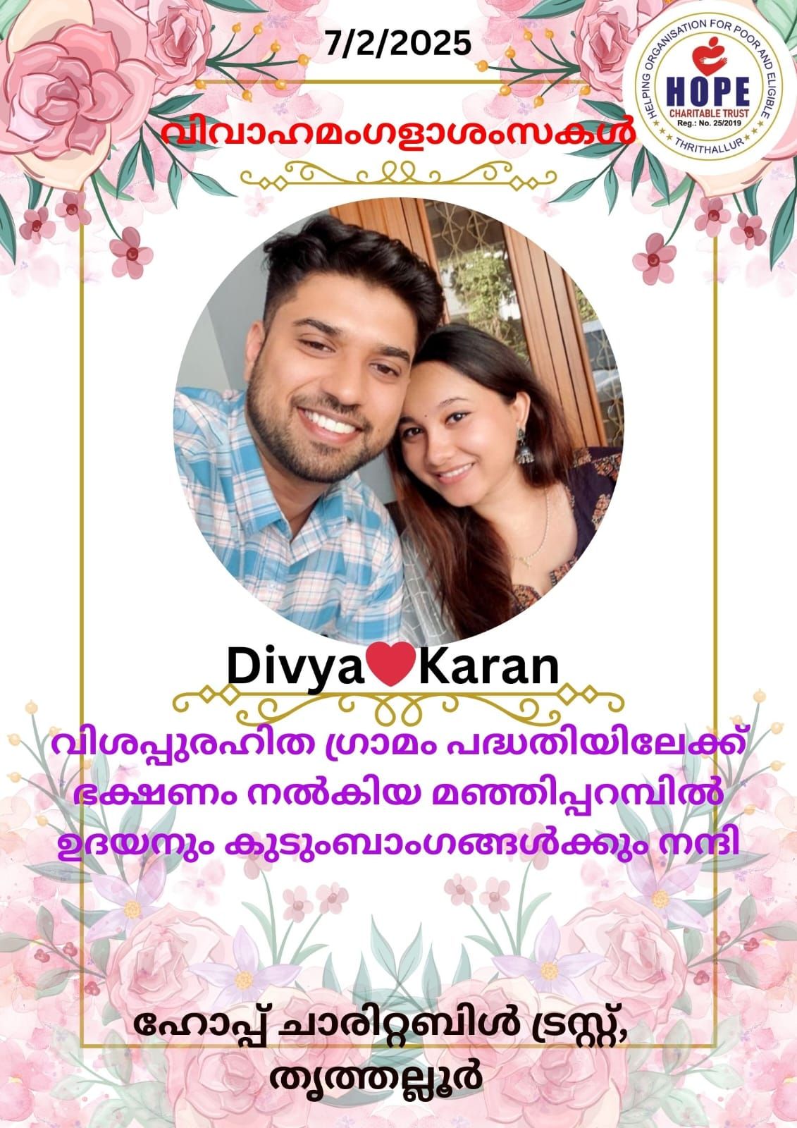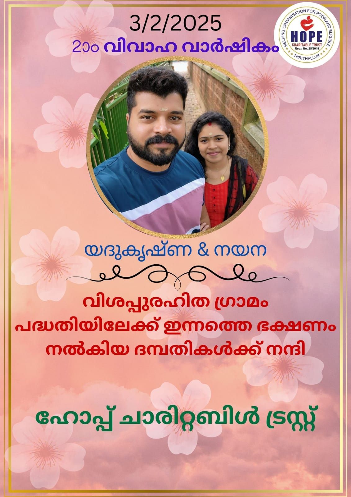 Hope Charitable Trust sincerely thanks Yadu Krishna and Nayana for generously providing today’s food (03.02.2025) on their 2nd wedding anniversary. Your kindness is truly appreciated. Wishing you both a joyful and blessed anniversary. Thank you!